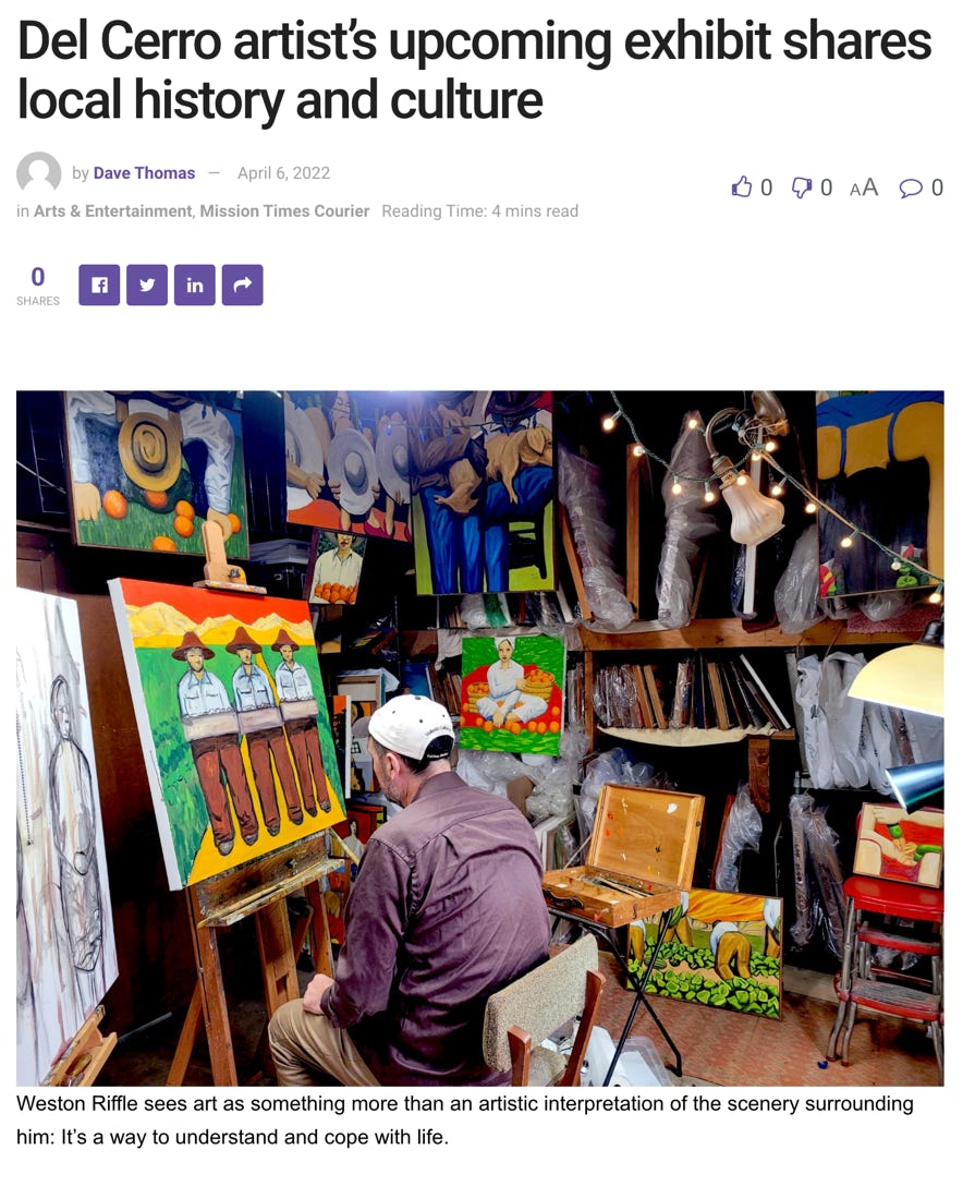 Schwab, Dave “ Artist Weston Riffle open new studio in Arts District Liberty Station” SD News August 8, 2024